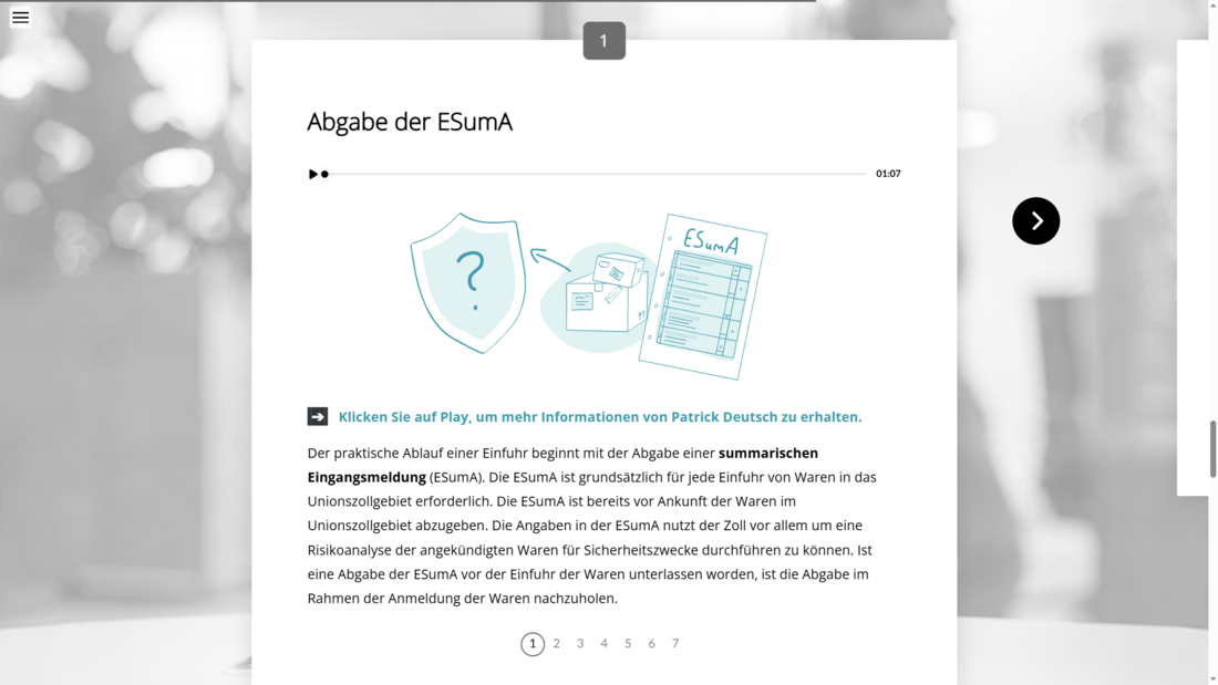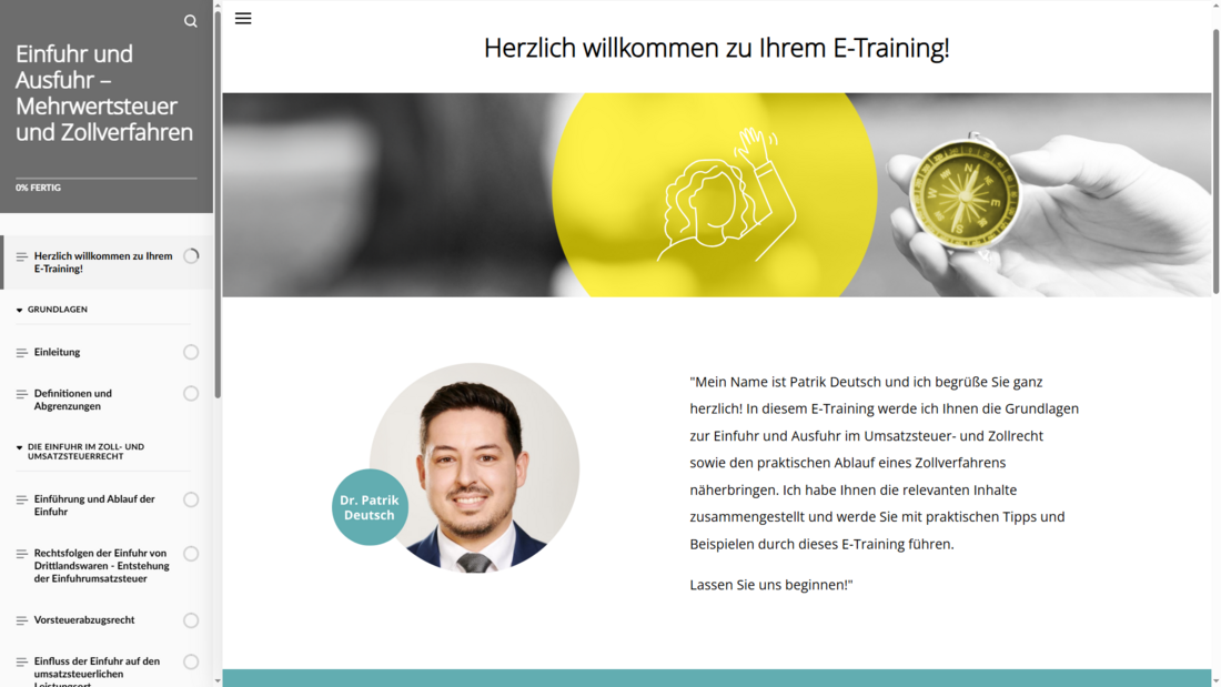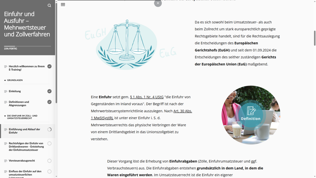 Ein fundiertes Verständnis der Struktur und Regelungssystematik des deutschen Umsatzsteuerrechts ist für nahezu alle Mitarbeitenden unverzichtbar. Dieses interaktive und motivierende E-Training gibt Einblicke in das Zollverfahren und behandelt sämtliche Aspekte zur Ein- und Ausfuhr von Waren.