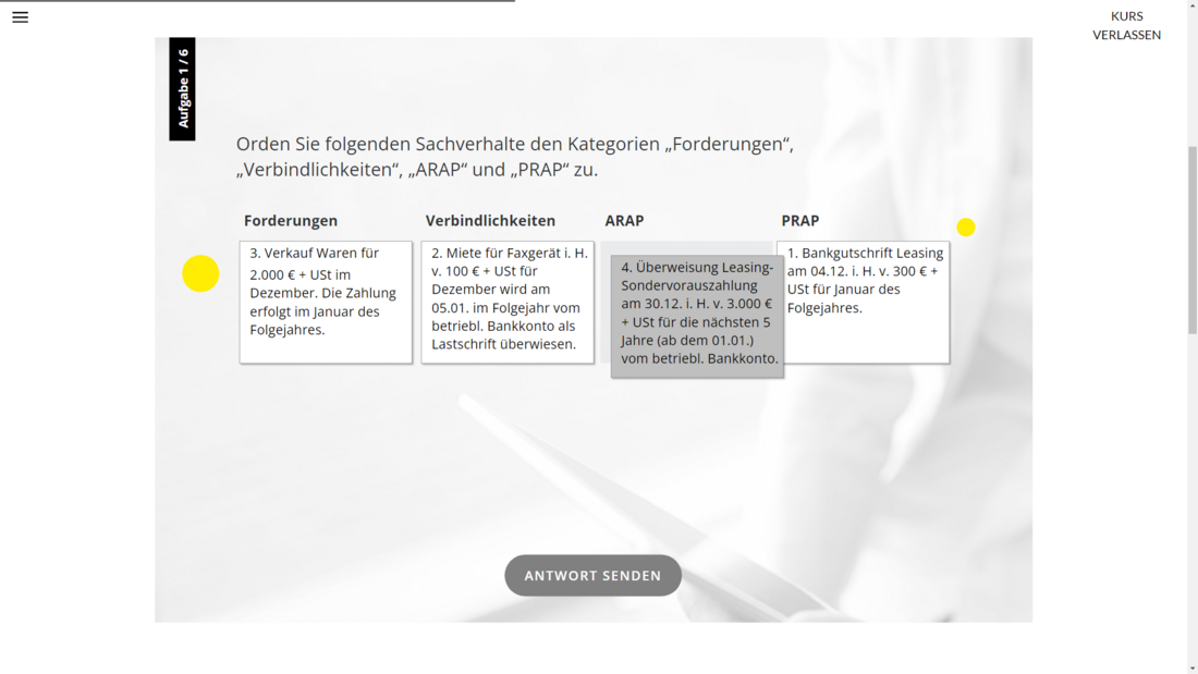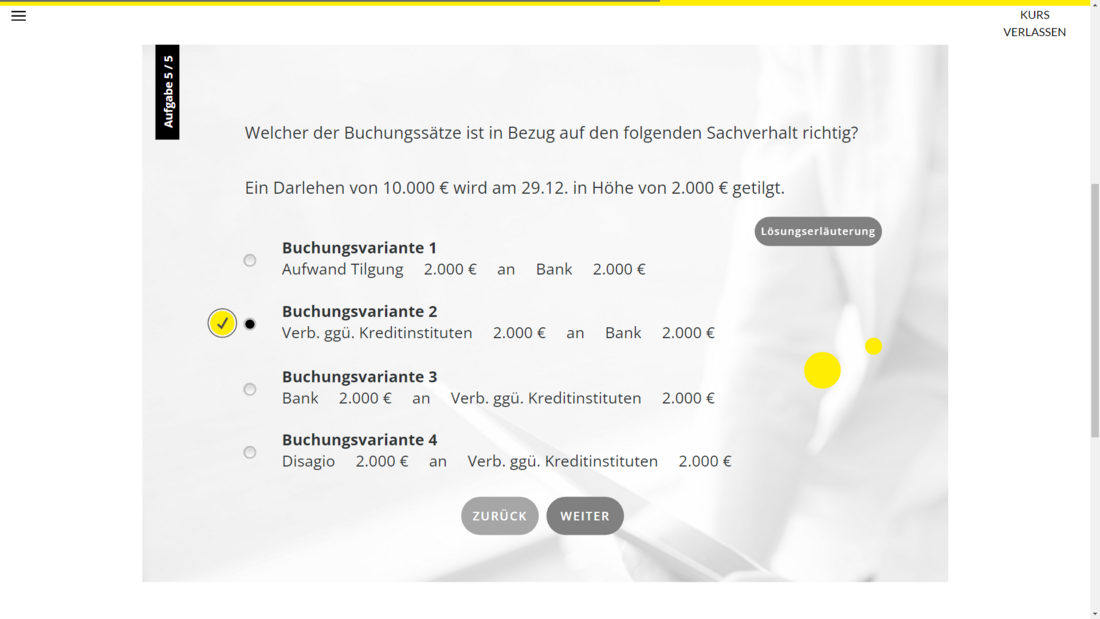 Ein Grundverständnis der Buchführung ist für nahezu alle Mitarbeitenden unverzichtbar. Dieses interaktive und motivierende E-Training vermittelt die Grundlagen zum Thema Geldkonten, Darlehen und Rechnungsabgrenzungsposten (RAP).