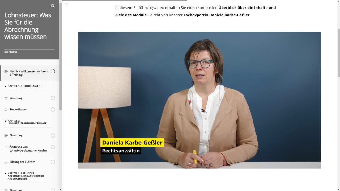 Ein fundiertes Verständnis der Lohnsteuer ist für die korrekte Entgeltabrechnung unverzichtbar. In diesem interaktiven E-Training lernen Teilnehmende, wie sich Steuerklassen und Lohnsteuerabzugsmerkmale auf die Lohnsteuerberechnung auswirken und wie die elektronischen Lohnsteuerabzugsmerkmale gebildet, abgerufen und bei Änderungen angepasst werden. Anhand konkreter Beispiele wird der Prozess der Lohnsteuerberechnung verständlich erklärt.