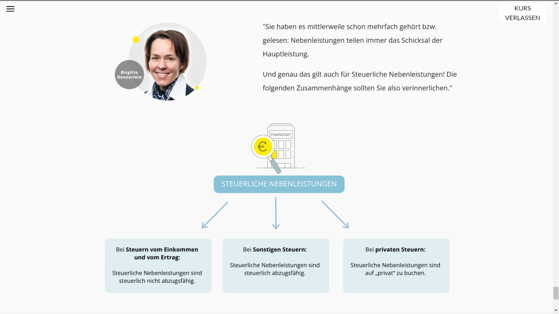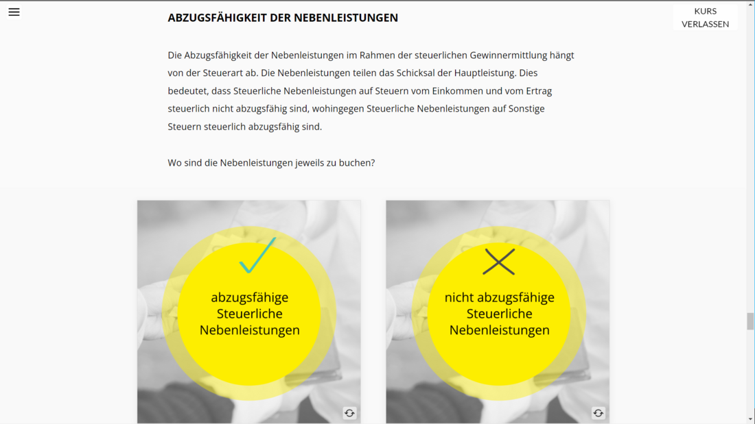 Ein Grundverständnis der Buchführung ist für nahezu alle Mitarbeitenden unverzichtbar. Dieses interaktive und motivierende E-Training vermittelt die Grundlagen zum Thema Steuern und steuerliche Nebenleistungen.