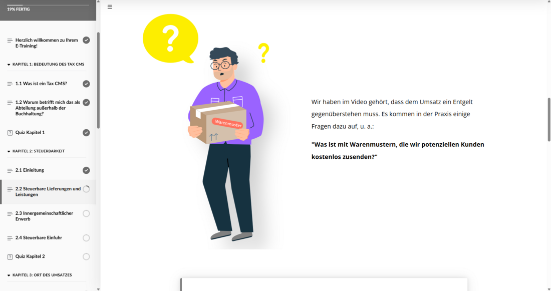 Es vermittelt Mitarbeitenden aus verschiedenen Bereichen, darunter Vertrieb, Einkauf, IT und Versand, die wichtigsten Grundlagen der Umsatzsteuer – verständlich, praxisnah und ohne juristische Tiefe. Die Teilnehmenden lernen, typische Risiken zu erkennen, Zusammenhänge zu verstehen und einzuschätzen, wann die Steuerabteilung eingebunden werden sollte.